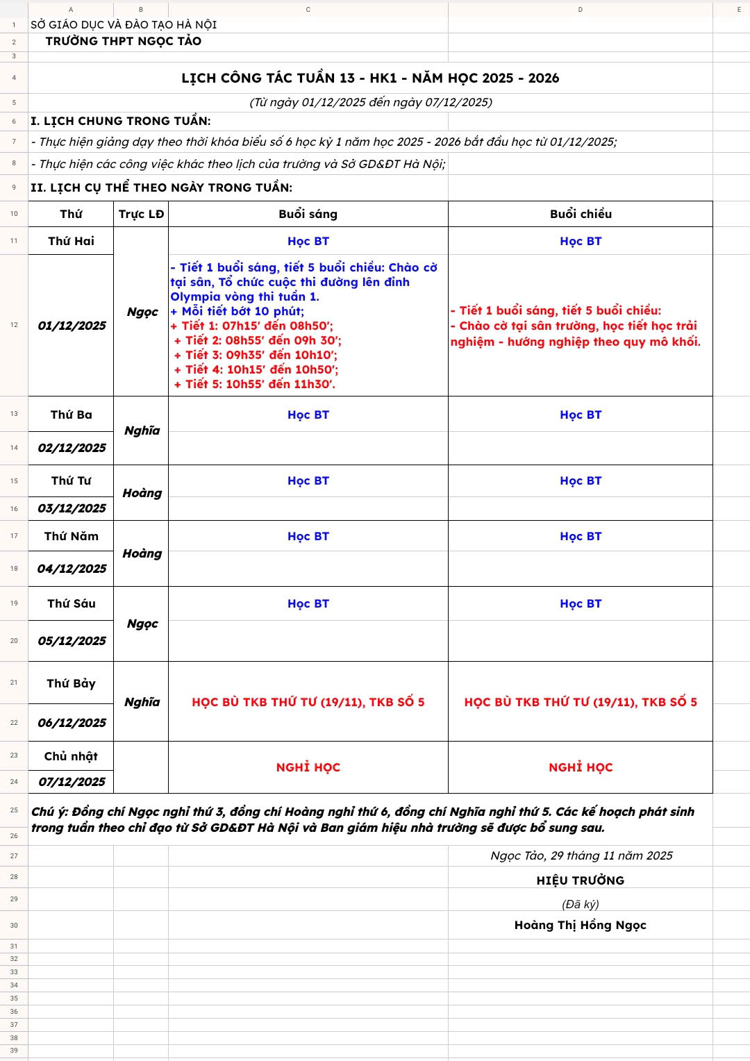 LỊCH CÔNG TÁC TUẦN 13 – HK1 – NĂM HỌC 2025 – 2026 (Từ ngày 01/12/2025 đến ngày 07/12/2025)