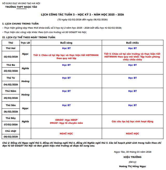 LỊCH CÔNG TÁC TUẦN 3 – HỌC KỲ 2 – NĂM HỌC 2025 – 2026 (Từ ngày 02/02/2026 đến ngày 08/02/2026)