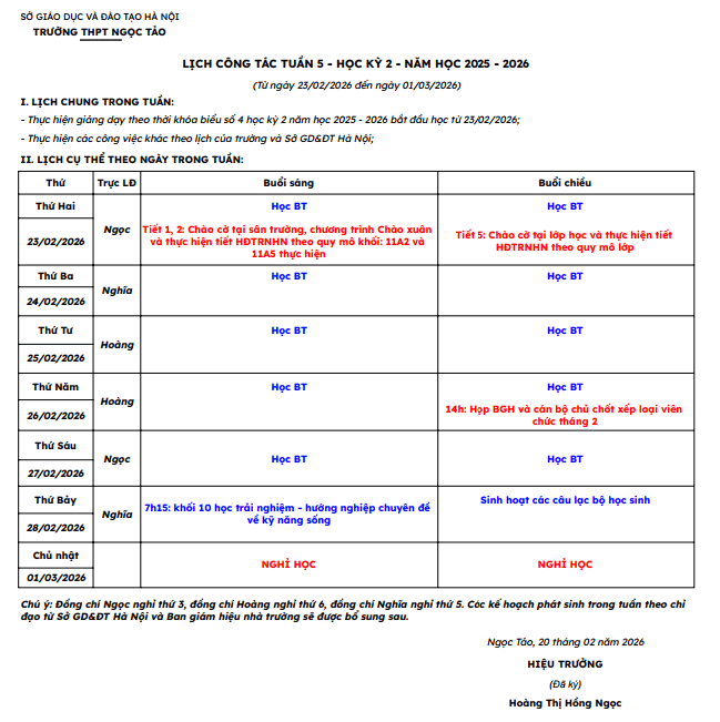 LỊCH CÔNG TÁC TUẦN 5 – HỌC KỲ 2 – NĂM HỌC 2025 – 2026 (Từ ngày 23/02/2026 đến ngày 01/03/2026)