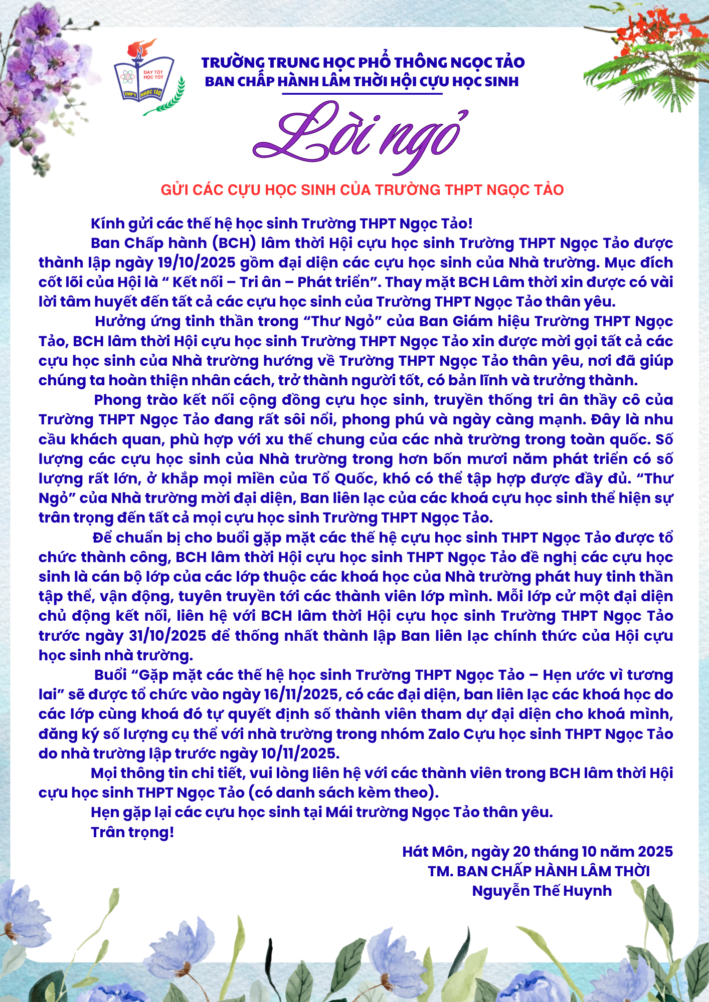 LỜI NGỎ GỬI CÁC CỰU HỌC SINH CỦA TRƯỜNG THPT NGỌC TẢO