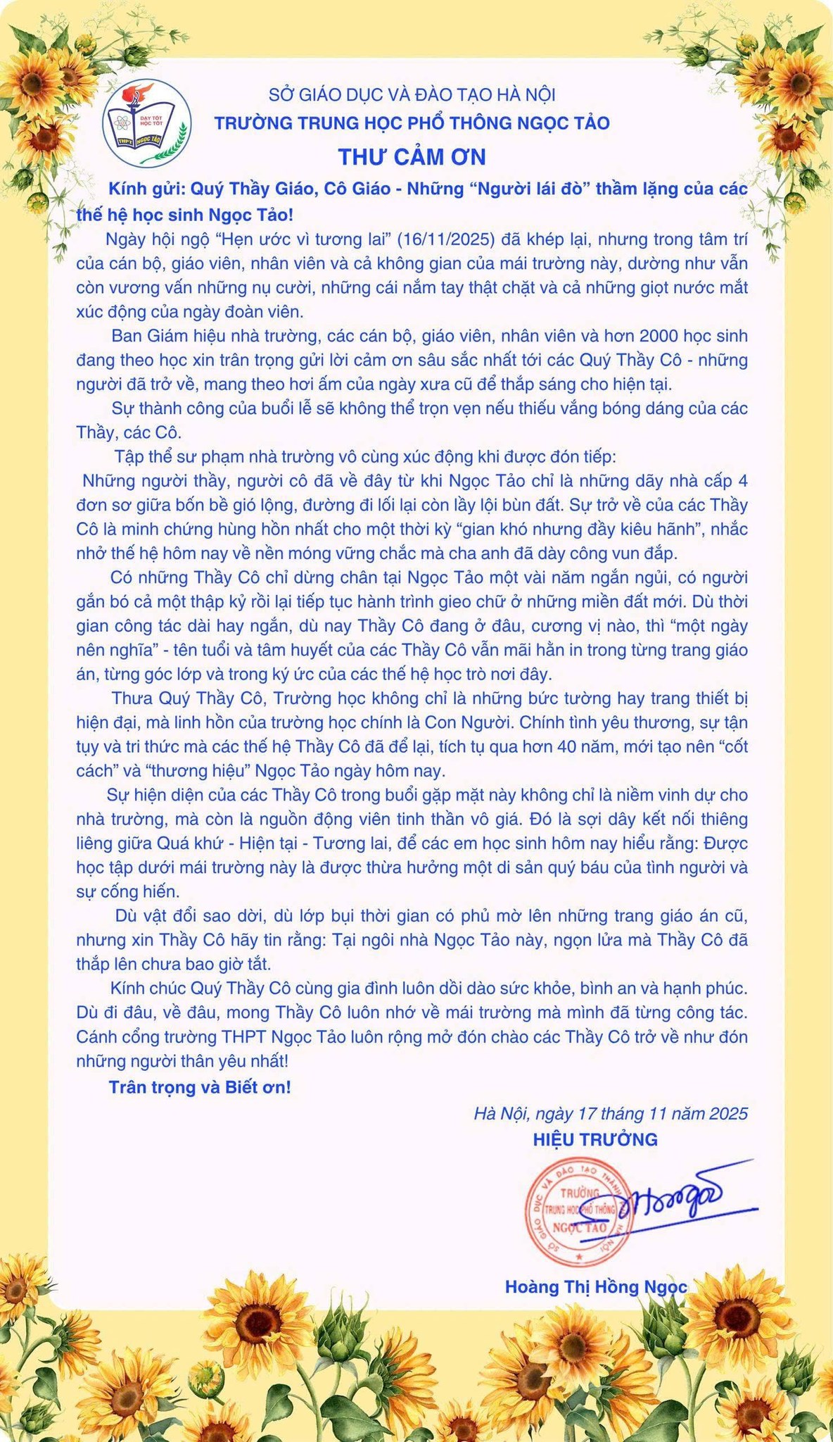 - Thư cảm ơn các thế hệ cựu học sinh của mái trường…