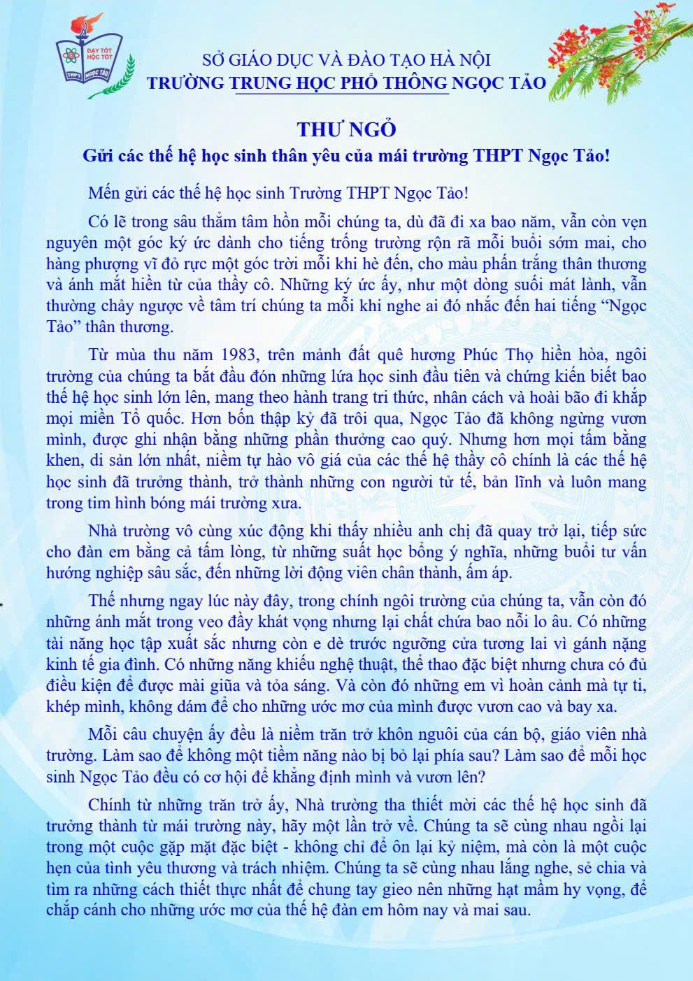 Thư ngỏ gửi các thế hệ học sinh thân yêu của mái trường THPT Ngọc Tảo